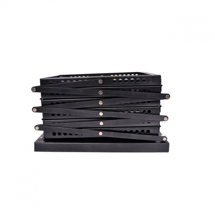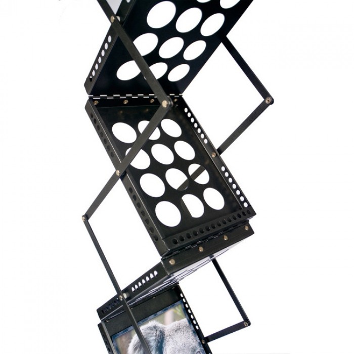 Our Pop-Up Literature Rack is heavy duty with it's metal construction and designed with appealing modern style. This product has a black powder-coated finish and 6 pockets. This pop-up literature rack is a great way to display your literature at trade shows. Its unique look captures the attention of anyone walking by your booth. The hollow holes design cuts out unnecessary weight while giving you an attractive look. Pop-up mechanism makes set-up a breeze; only takes a few seconds for the unit to be fully assembled Arrive at a trade show and be the first to display your literature in no time. With its fast assembly time and lightweight design, this convenient stand can go anywhere with you. Included is a traveling case so you can easily take the stand with you on the go. Includes: