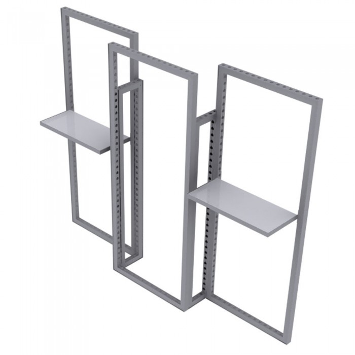 Modco Modular Display 3 is a three-dimensional 10’ x 10’ pre-designed exhibit booth. Stylish and lively, this booth is built using tool-free perforated modular aluminum frames. Multiple size frames connect using toolless pin connectors. Features shelves along the backwall to showcase your products. Perforations are completely covered for a flawless finish.